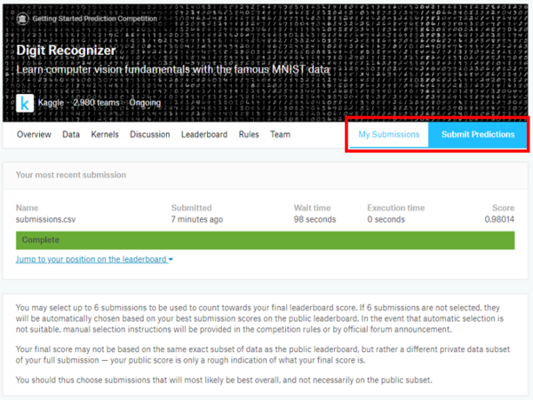 Submit Predictions로 만든 csv 파일을 제출하면 score를 내준다.
