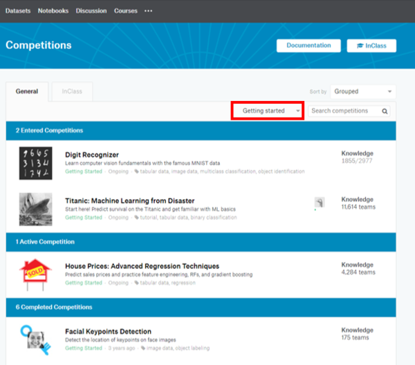 Kaggle 홈페이지에서 Competitions에 들어가게 되면,