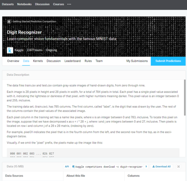 Tutorial 로는 역시 MNIST가 제격이므로, Digit Recognizer를 들어갔다.