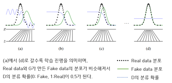 이는 1) G가 수식 V를 최소화 해야하고, 2) D는 수식 V를 최대화하기 위한 방법을 찾는 것이 목적이다.